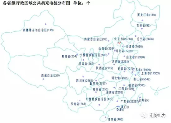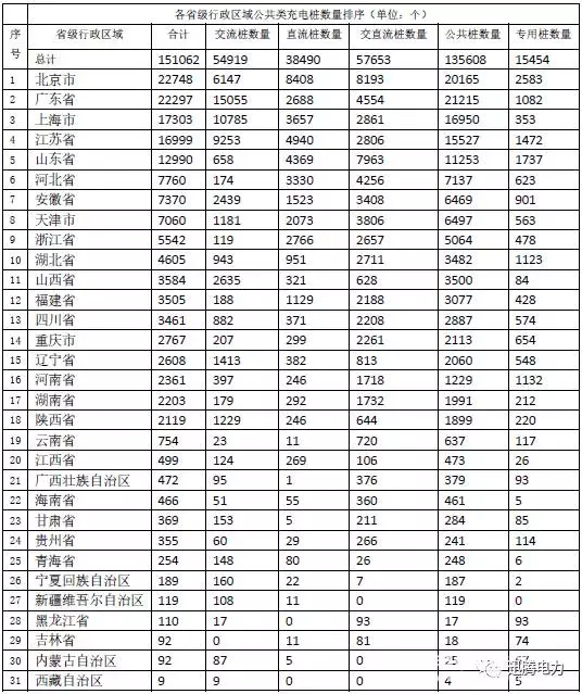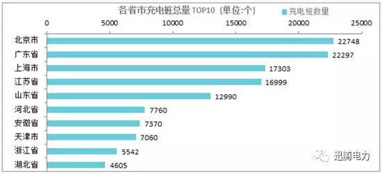 省級行政區域內所擁有的公共類充電樁數量前十的分別為:北京22748個、廣東22297個、上海17303個、江蘇16999個、山東12990個、河北7760個、安徽7370個、天津7060個、浙江5542個、湖北4605個。